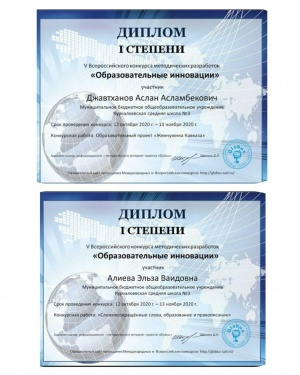 29.10.2020В V Всероссийском конкурсе методических разработок «Образовательные инновации» приняли участие и получили дипломы 1 степени наши педагоги Джаватханов А.А., Алиева Э.В.Цель данного конкурса:мотивации педагогов к активному использованию инновационных технологий в образовательном процессе;представления и популяризации педагогического опыта работников образования.