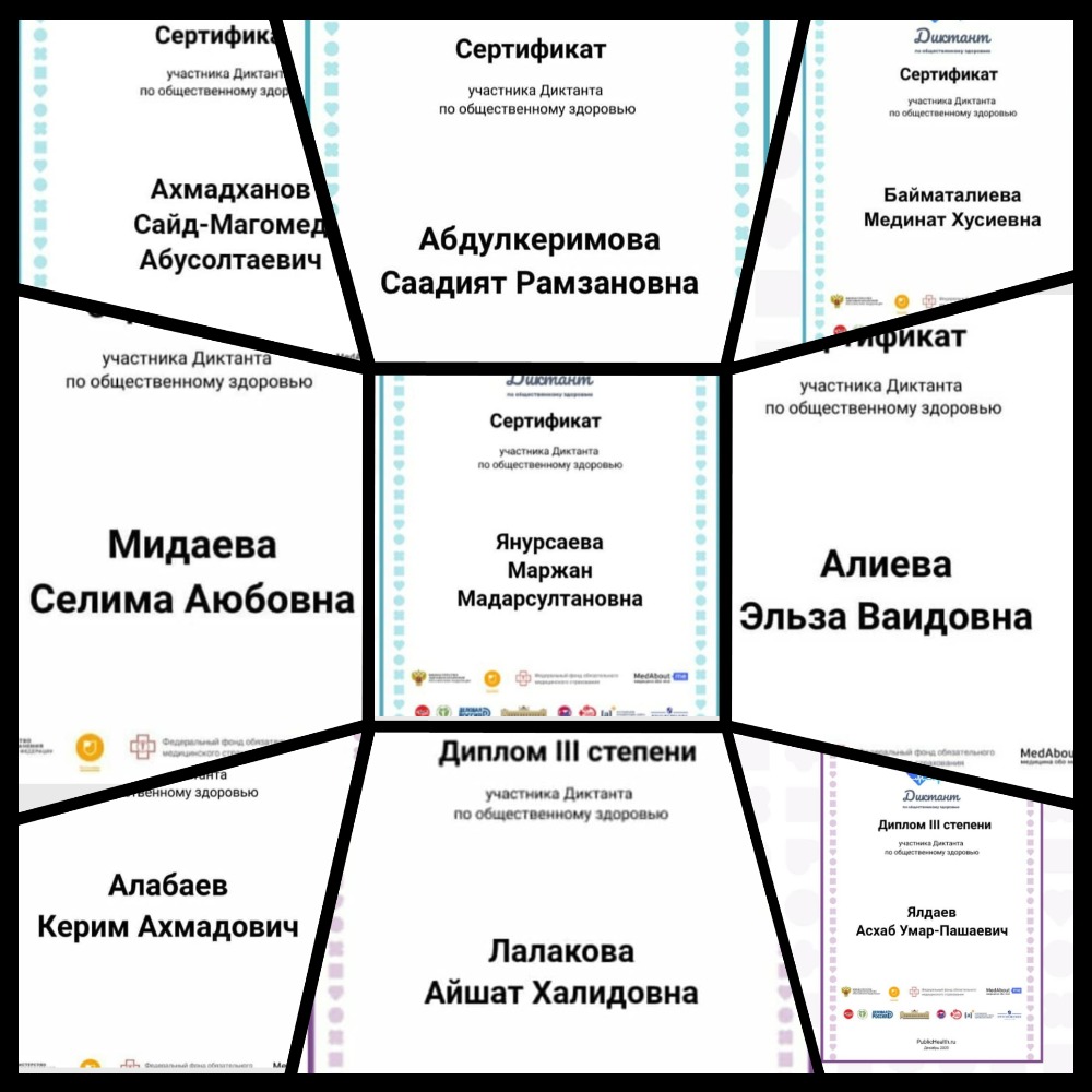 23.12.2020В рамках реализации федерального проекта " Демография" и в целях повышения общей грамотности населения в сфере профилактики неинфекционных заболеваний, а также популяризации здорового образа жизни среди всех групп населения проводится Всероссийский диктант по общественному здоровью.Учителя СШ 3 успешно прошли диктант и получили дипломы и сертификаты.