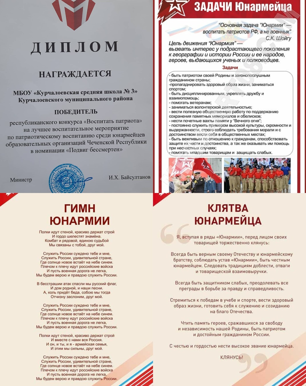26.12.2020За лучшее воспитательное мероприятие по патриотическому воспитанию и победе, среди юнармейцев образовательных организаций Чеченской Республики в номинации ,,Подвиг бессмертен" в республиканском конкурсе ,,Воспитать патриота" наградил ДИПЛОМОМ министр образования И.Х.Байсултанов. @i.baysultanov_95 .Патриотическое воспитание – одно из ключевых направлений работы у всего педагогического сообщества.— Воспитание патриотизма – длительная, нескончаемая работа. Патриотическое воспитание – не единоразовая акция или какой-нибудь флешмоб.В столь тонком вопросе крайне важно уделять большое внимание развитию так называемой сопричастности к истории страны. Мало знать даты и события, произошедшие десятилетия тому назад: дети должны осознать (хотя это, конечно, нелегко) цену, которую заплатило «поколение победителей» – за мирное небо, за то, чтобы мы с вами жили в суверенном государстве и были свободными.Учитель ОБЖ Эльтемиров Хасан Лом-Алиевич много трудится ивоспитывает юнармейцев «быть верным своему Отечеству и юнармейскому братству, преодолевать все преграды в борьбе за правду и справедливость, готовить себя к служению и созиданию на благо Отечества, быть патриотом и достойным гражданином России, с честью и гордостью нести высокое звание юнармейца».С гордостью за юный отряд юнармейцев, с благодарностью и с уважениемдиректор школы Алиева Р.Д.