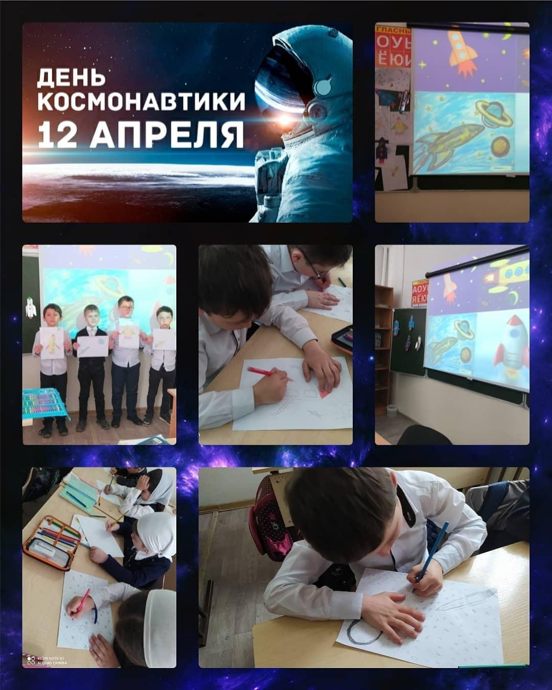 12.04.2021Взлетела к звездам голубымСтремительно ракета.И с замиранием глядитВесь мир на чудо это.По телевизору следятЗа жизнью космонавта.Ему, все знают, нелегко,Работа трудновата.Но верил парню весь народ -Он справится с заданьем!Героя встретят на ЗемлеС любовью и признаньем!К дню космонавтики урок рисования во 2 ,,в"классе.Уч.нач.кл. Шаипова М.М.
