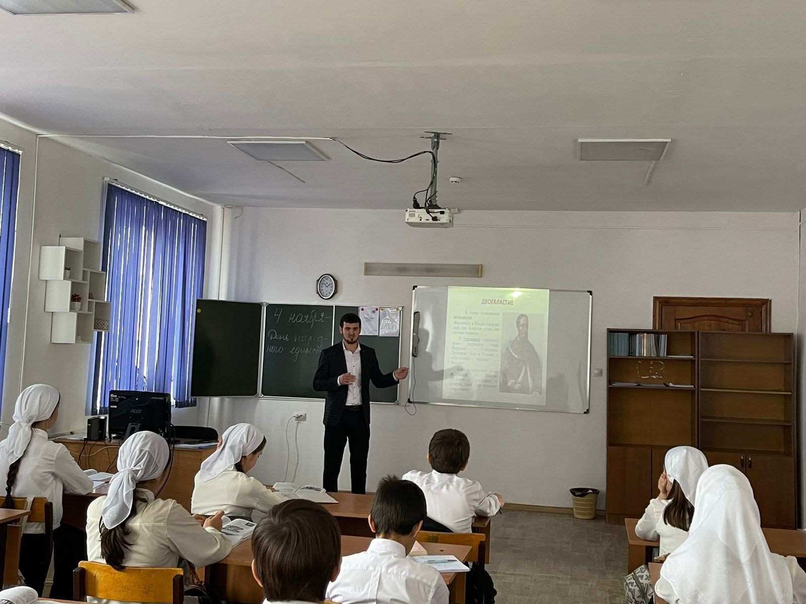04.11.2023Этот день занимает особое место среди государственных праздников современной России. День народного единства — это праздник, который дети должны знать с раннего возраста. Проведение мероприятий патриотического направления очень важно в воспитании подрастающего поколения, ведь формирование отношения к своей стране, формирование таких качеств как гражданственность, патриотизм. Воспитание в детях патриотических чувств, любви к Родине, гордости за ее достижения, уверенности в том, что Россия — великая многонациональная страна с героическим прошлым и счастливым будущим – основная цель проведения мероприятия, посвященного празднованию Дня народного единства. Классный час провел учитель истории Вахаев А.А., совместно с советником по ВР Алиевой Э.В.