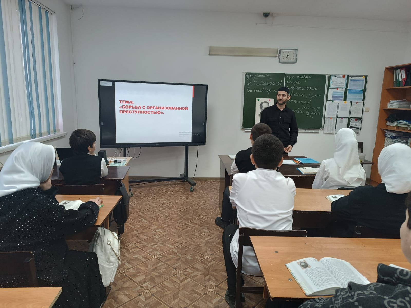 18.11.2024Проведено мероприятие по борьбе с организованной преступностью Совместно с сотрудниками Управления ФСБ России по Чеченской Республике проведено мероприятие на тему: «борьба с организованной преступностью».В ходе встречи со школьниками сотрудники Управления рассказали, что основными целями в борьбе с организованной преступностью являются выявление, предупреждение, пресечение, раскрытие организованной преступности, а также ликвидация последствий ее проявлений.В рамках проведенного мероприятия также приведен пример совершенного преступления, относящийся к организованной преступности, а также сроки наказания для лиц, привлеченных к уголовной ответственности за совершение указанного деяния по статье 210 УК РФ.