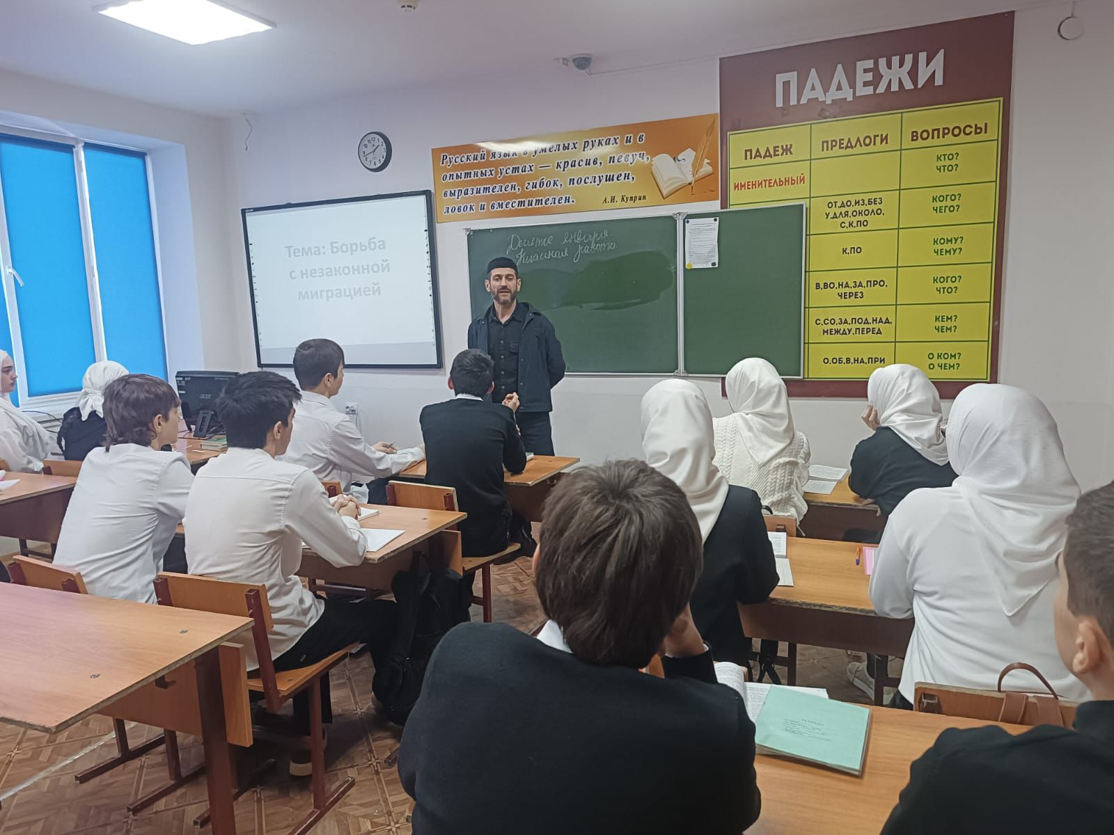 14.01.2025Совместно с сотрудниками Управления ФСБ России по Чеченской Республике проведено мероприятие на тему: «борьба с незаконной миграцией».В ходе встречи со школьниками сотрудники Управления рассказали, что основными целями в борьбе с незаконной миграцией являются обеспечение эффективных мер по защите прав мигрантов, предупреждение их незаконного въезда, а также использования в террористических целях.В рамках проведенного мероприятия приведены примеры совершенных преступлений, относящихся к незаконной миграции, а также сроки наказания для лиц, привлеченных к уголовной ответственности за совершение указанного деяния по статье 322.1 УК РФ.