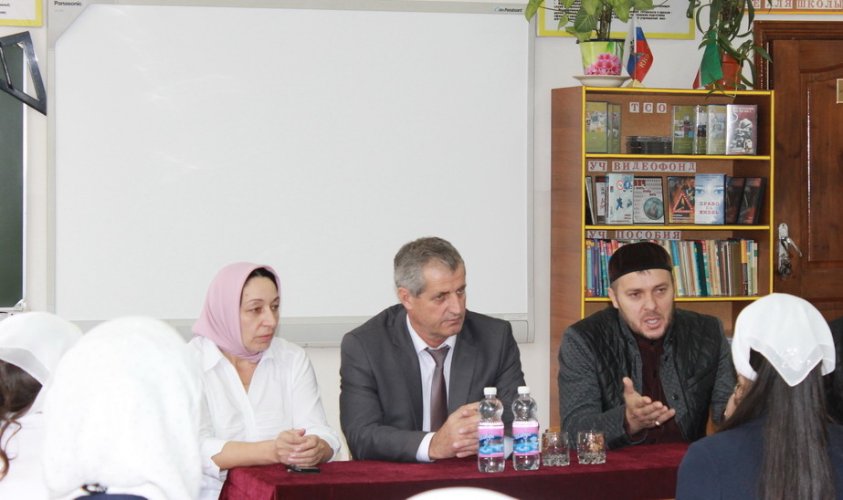 Выступила: Директор школы, Алиева Раиса Джунаидовна, в своем выступлении, она поблагодарила, кадия Курчалоевского района, за то, что он нашел время посетить нашу школы, провести полезную беседу. Только так, совместными усилиями духовенства, родителей и педагогов мы можем достичь успехов.